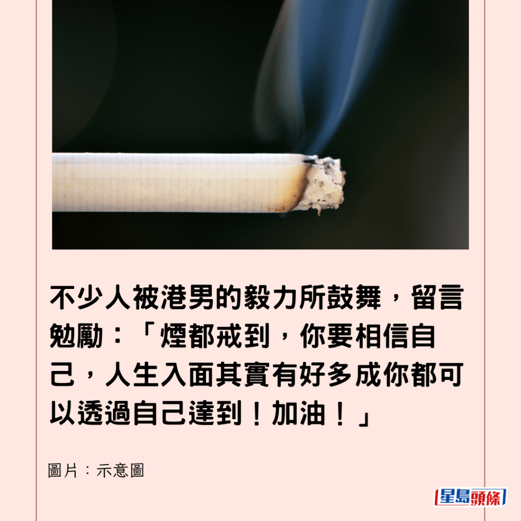 不少人被港男的毅力所鼓舞,留言勉勵:「煙都戒到,你要相信自己,人生入面其實有好多成你都可以透過自己達到!加油!」