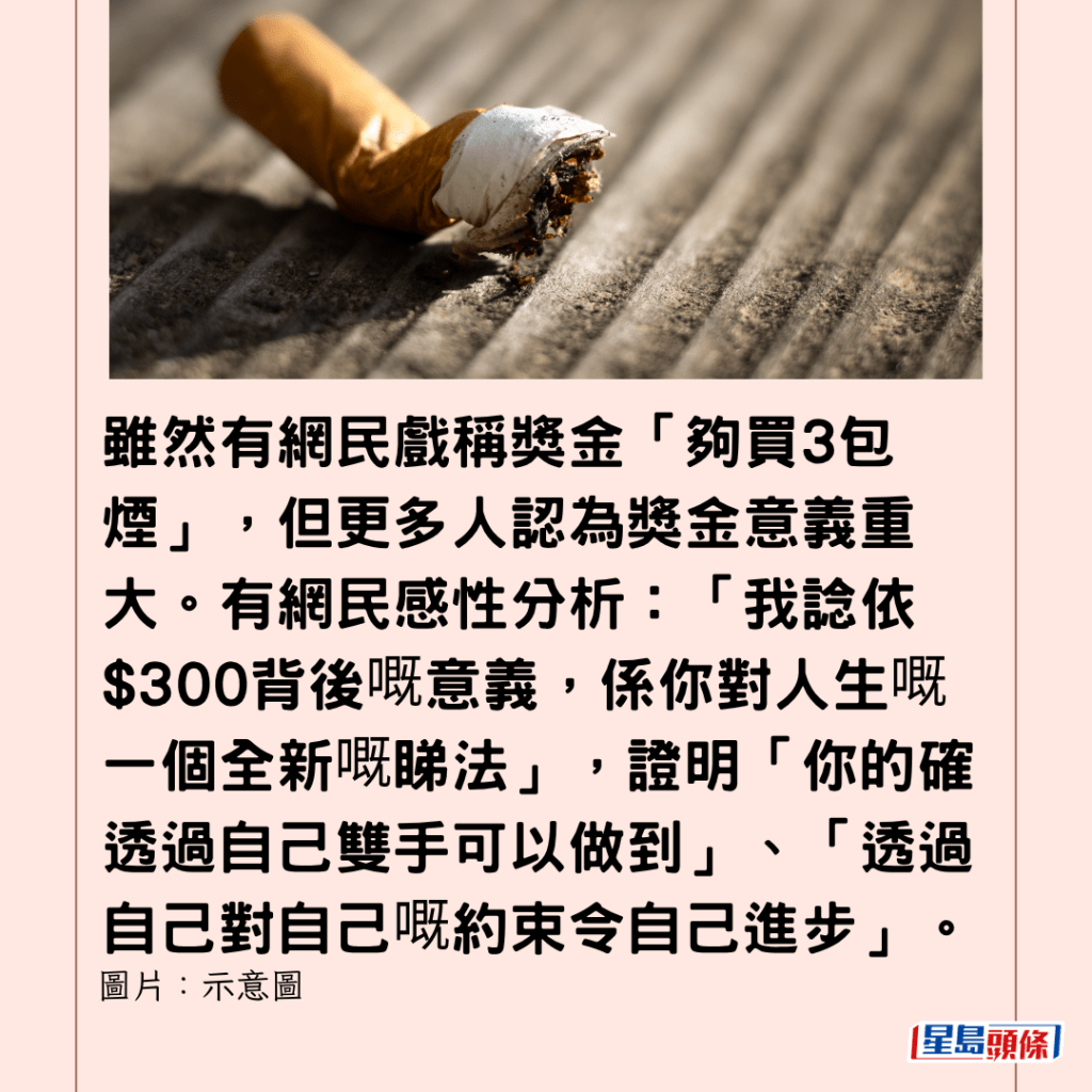 雖然有網民戲稱獎金「夠買3包煙」,但更多人認為獎金意義重大。有網民感性分析:「我諗依$300背後嘅意義,係你對人生嘅一個全新嘅睇法」,證明「你的確透過自己雙手可以做到」、「透過自己對自己嘅約束令自己進步」。