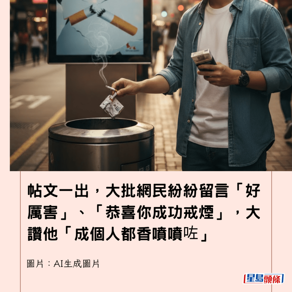 帖文一出,大批網民紛紛留言「好厲害」、「恭喜你成功戒煙」,大讚他「成個人都香噴噴咗」