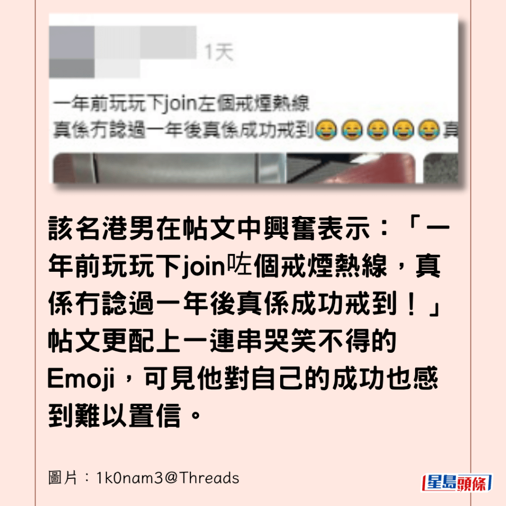 該名港男在帖文中興奮表示:「一年前玩玩下join咗個戒煙熱線,真係冇諗過一年後真係成功戒到!」帖文更配上一連串哭笑不得的Emoji,可見他對自己的成功也感到難以置信。