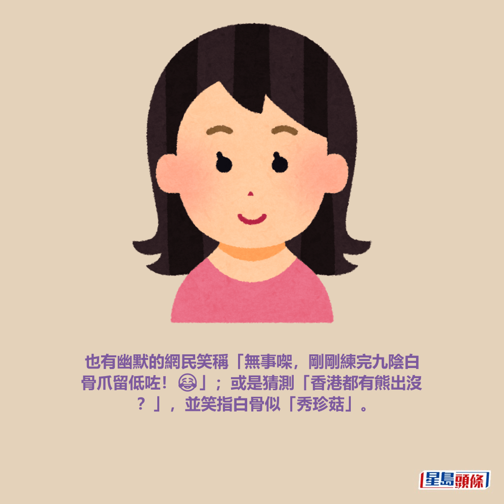 也有幽默的網民笑稱「無事㗎,剛剛練完九陰白骨爪留低咗!😂」;或是猜測「香港都有熊出沒?」,並笑指白骨似「秀珍菇」。