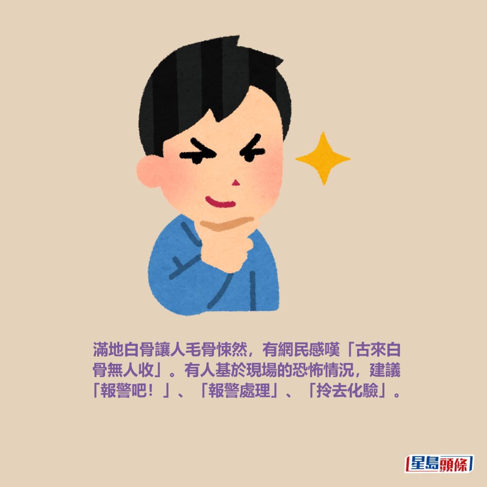 滿地白骨讓人毛骨悚然,有網民感嘆「古來白骨無人收」。有人基於現場的恐怖情況,建議「報警吧!」、「報警處理」、「拎去化驗」。