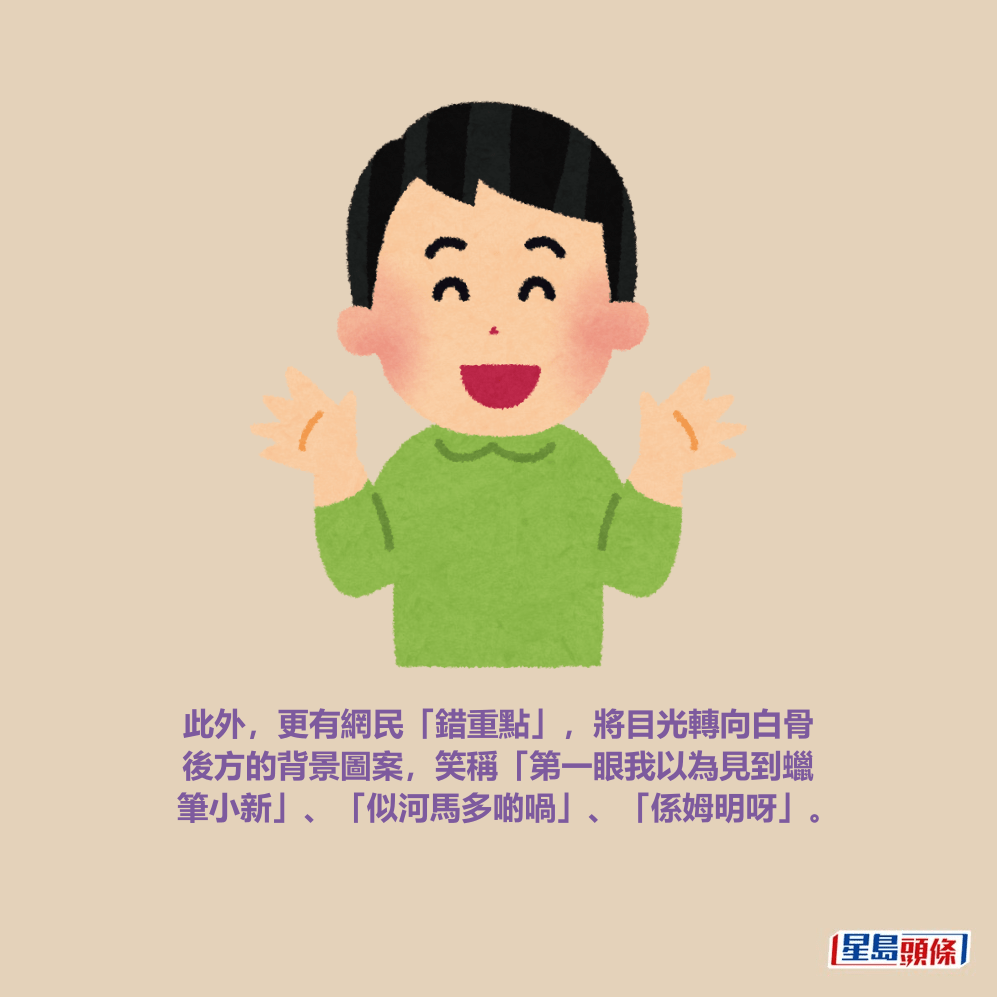 此外,更有網民「錯重點」,將目光轉向白骨後方的背景圖案,笑稱「第一眼我以為見到蠟筆小新」、「似河馬多啲喎」、「係姆明呀」。