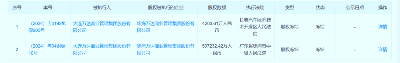 據《星島》查詢工商信息,萬達商管目前仍有兩筆股權凍結事項,其中一筆由珠海中院執行,萬達所持的所有萬達商管股權(50.72億股)都已被凍結。按照2023年萬達商管IPO前的估值,被凍結股權價值近1400億元。