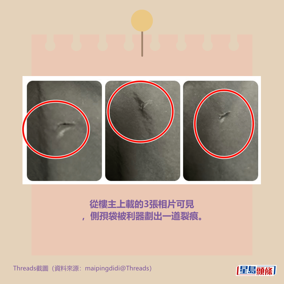 樓主特別#hashtag(話題標記)「小心扒手」和「提防扒手」。從樓主上載的3張相片可見,側孭袋被利器劃出一道裂痕。