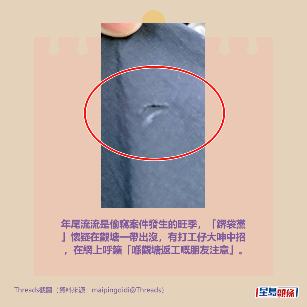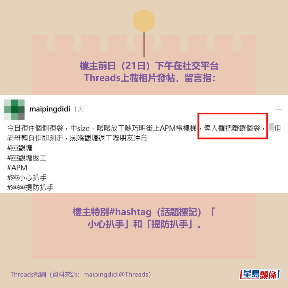 樓主前日(21日)下午在社交平台Threads上載相片發帖,留言指「今日孭住個側孭袋,中size(大小),啱啱放工喺巧明街上APM(商場)電樓梯,俾人攞把嘢鎅個袋,X佢老X轉身佢即刻走,喺觀塘返工嘅朋友注意」。