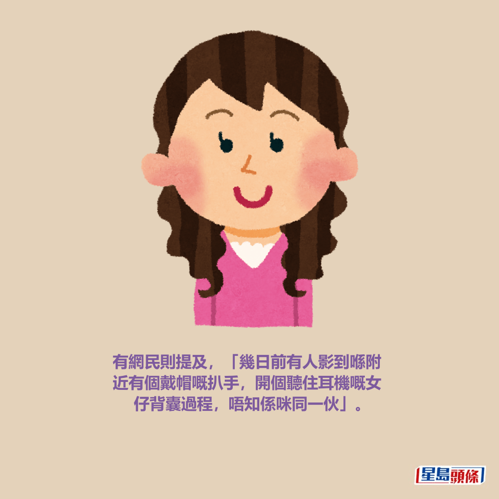 有網民則提及,「幾日前有人影到喺附近有個戴帽嘅扒手,開個聽住耳機嘅女仔背囊過程,唔知係咪同一伙」。