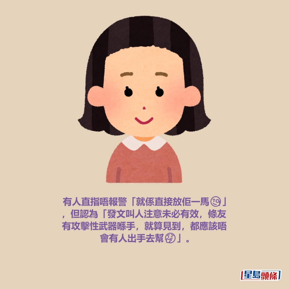 有網民建議樓主報警,指「報警處理,等佢地睇CCTV(閉路電視)」,有人直指唔報警「就係直接放佢一馬🧐」,但認為「發文叫人注意未必有效,條友有攻擊性武器喺手,就算見到,都應該唔會有人出手去幫🤔」;有人更加腳軟地直言「捉到會唔會俾佢鎅兩刀㗎」。