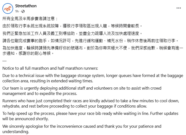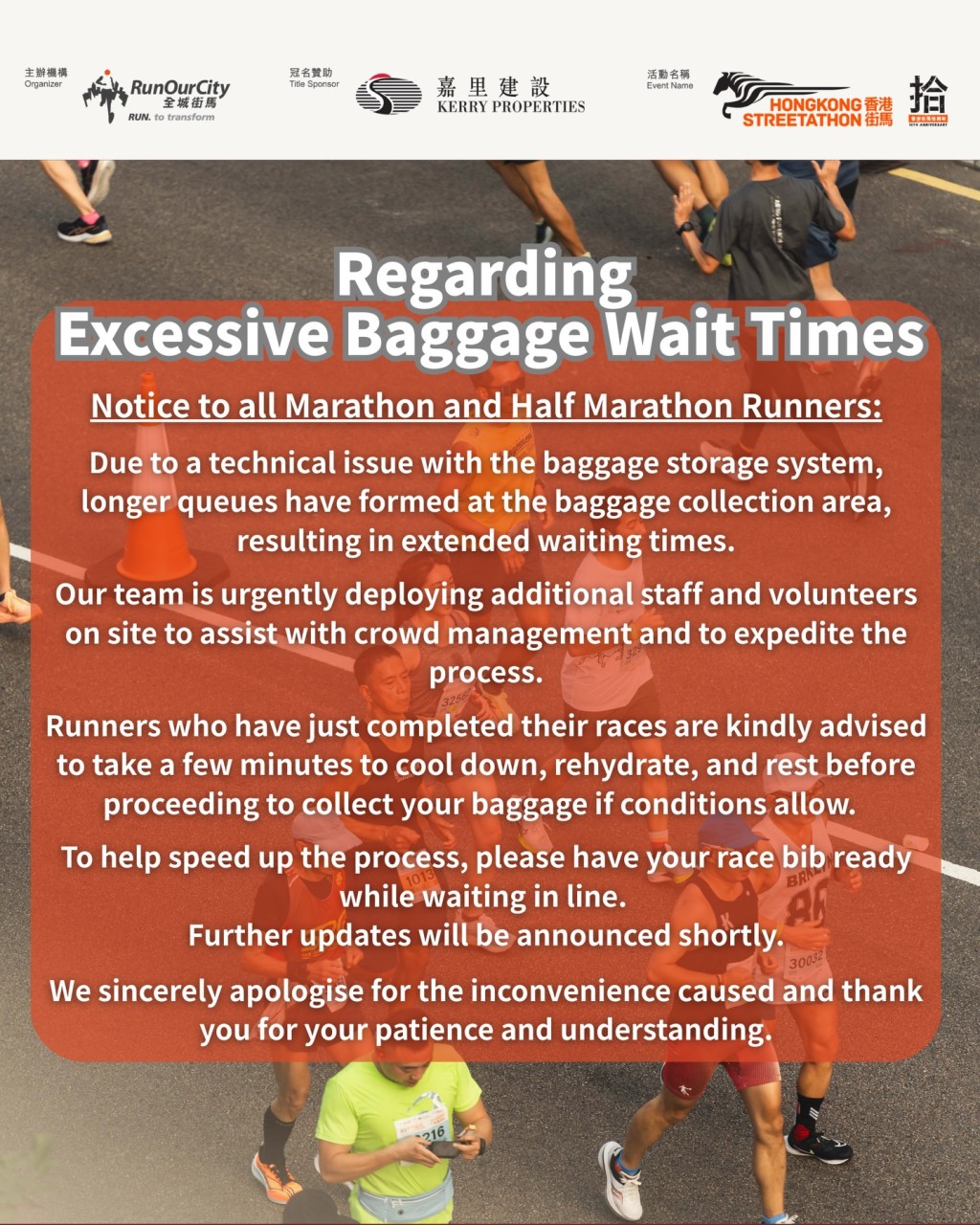 主辦方呼籲,各位剛完成賽事的跑手,如情況許可,先進行緩和運動、補充水分,稍作休息後再前往領取行李。為加快進度,輪候時請預先準備好號碼布。主辦方指,對於為跑手帶來極大不便深感抱歉,稍候會有進一步通知。