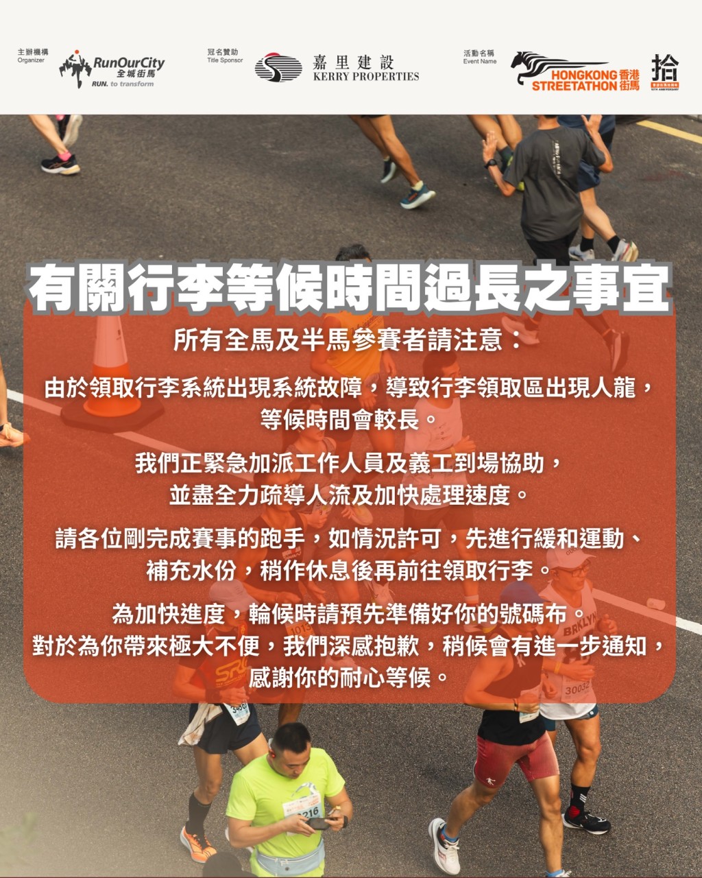 「香港街馬2025」今日(23日)舉行,早上全馬及半馬賽事已陸續完成,然而社交平台上有多名參加者反映,完成賽事後領取行李須大排長龍,場面混亂。主辦單位「全城街馬」指出,由於領取行李系統出現故障,導致行李領取區出現人龍,等候時間會較長。