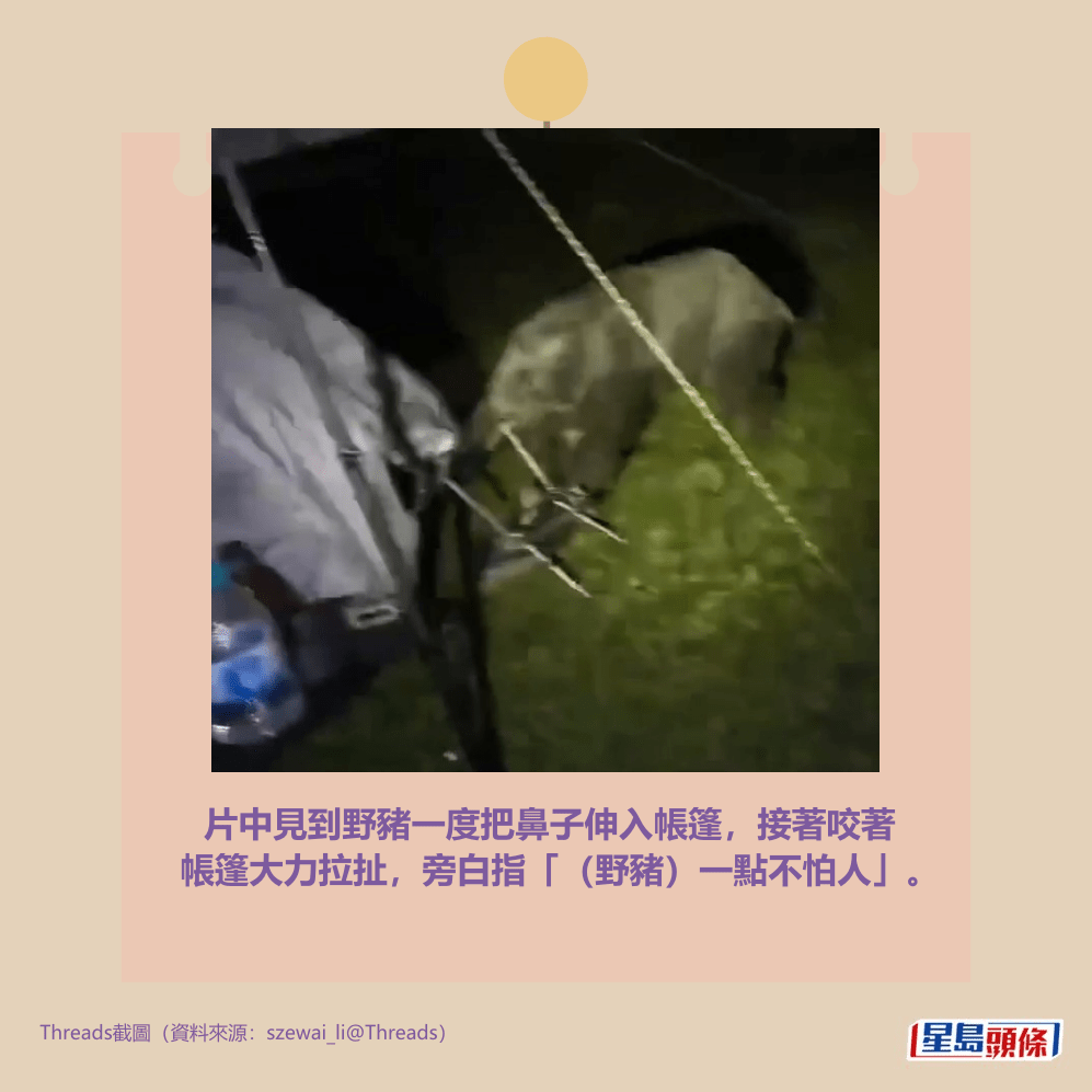 片中見到野豬一度把鼻子伸入帳篷,接著咬著帳篷大力拉扯,旁白指「(野豬)一點不怕人」;短片中後段見到兩名大漢持樹枝邊揮舞邊呼喝,野豬遇勁敵後才倖倖然離開。從樓主天亮後拍攝的相片見到,帳篷損毀嚴重。