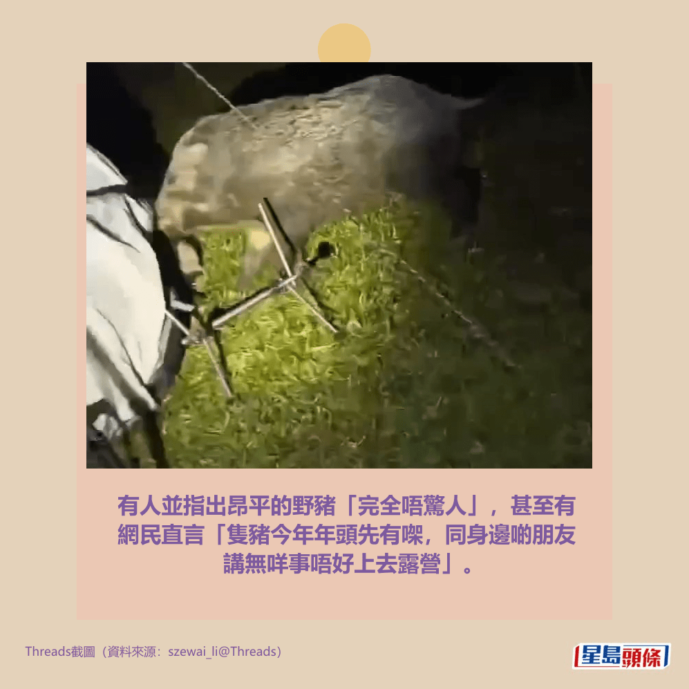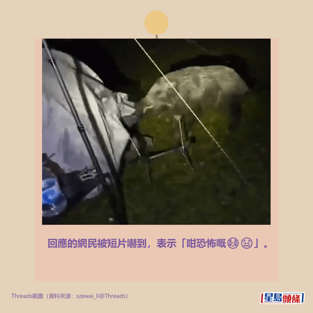 回應的網民被短片嚇到,表示「咁恐怖嘅😳😖」,並指出昂平的野豬「完全唔驚人」,甚至有網民直言「隻豬今年年頭先有㗎,同身邊啲朋友講無咩事唔好上去露營」。