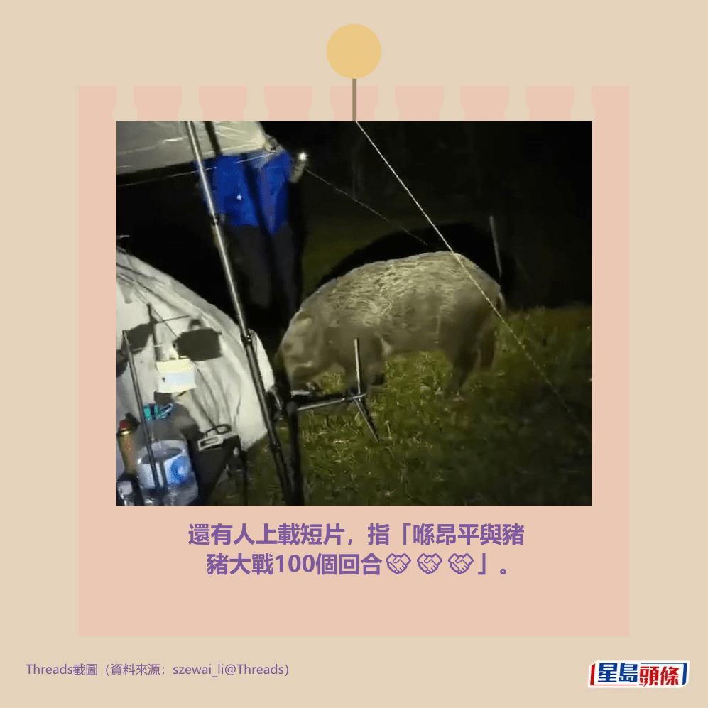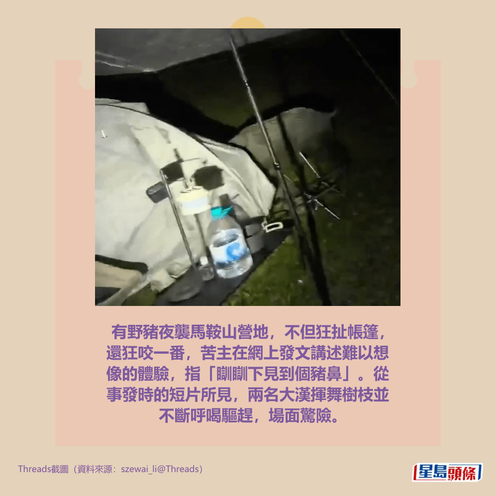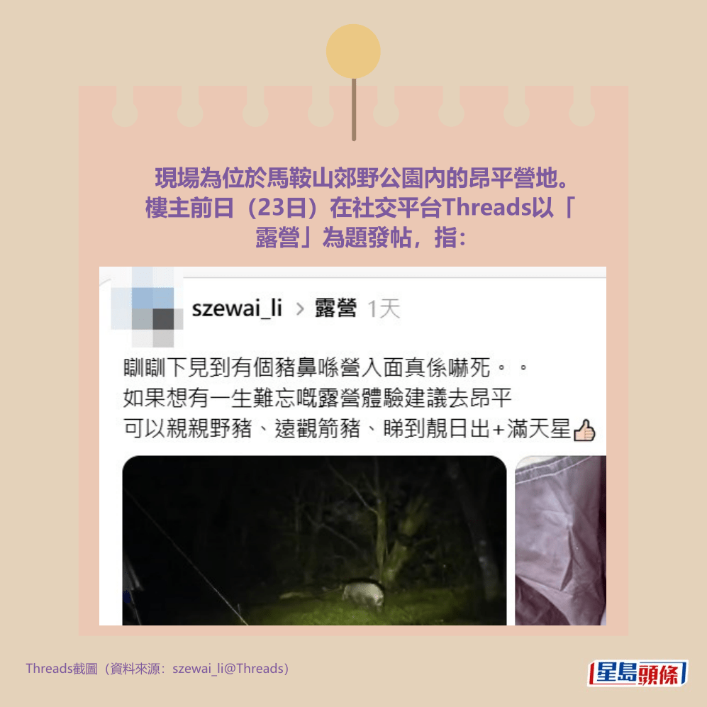 現場為位於馬鞍山郊野公園內的昂平營地。樓主前日(23日)在社交平台Threads以「露營」為題發帖,指「瞓瞓下見到有個豬鼻喺營入面真係嚇死……如果想有一生難忘嘅露營體驗建議去昂平,可以親親野豬、遠觀箭豬、睇到靚日出+滿天星👍🏻」。
