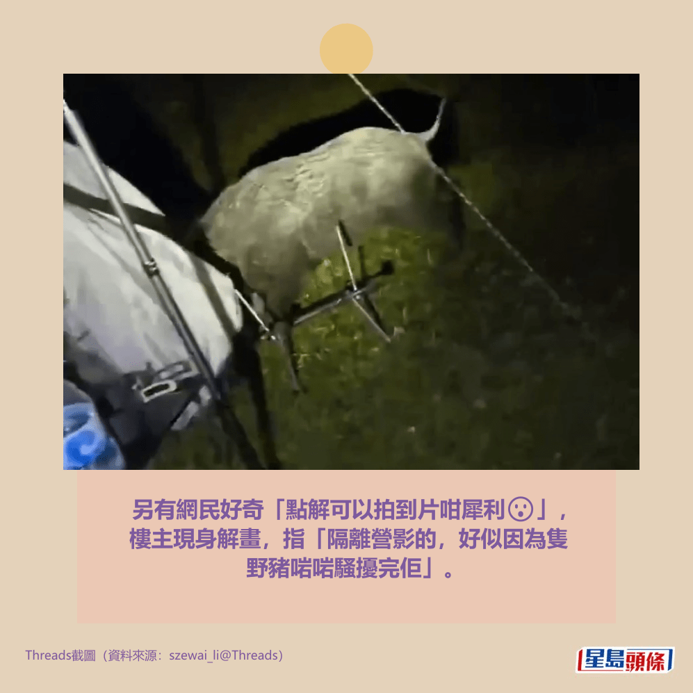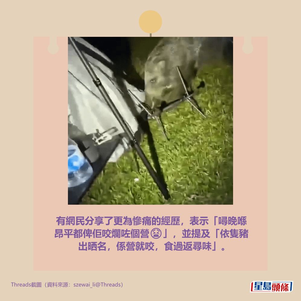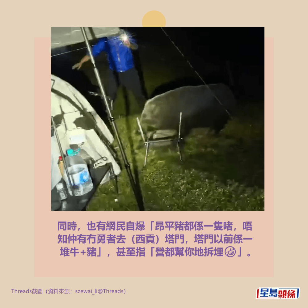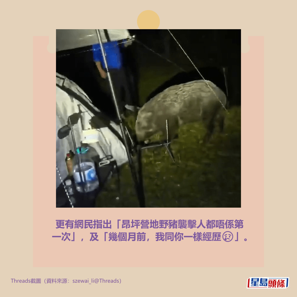 現場為位於馬鞍山郊野公園內的昂平營地。樓主前日(23日)在社交平台Threads以「露營」為題發帖,指「瞓瞓下見到有個豬鼻喺營入面真係嚇死……如果想有一生難忘嘅露營體驗建議去昂平,可以親親野豬、遠觀箭豬、睇到靚日出+滿天星👍🏻」。