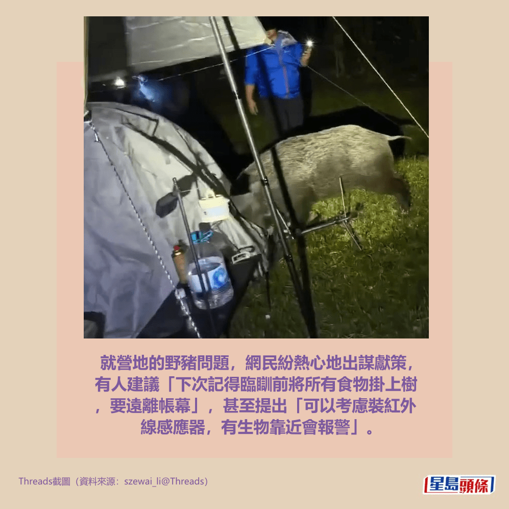 就營地的野豬問題,網民紛熱心地出謀獻策,有人建議「下次記得臨瞓前將所有食物掛上樹,要遠離帳幕」,甚至提出「可以考慮裝紅外線感應器,有生物靠近會報警」。