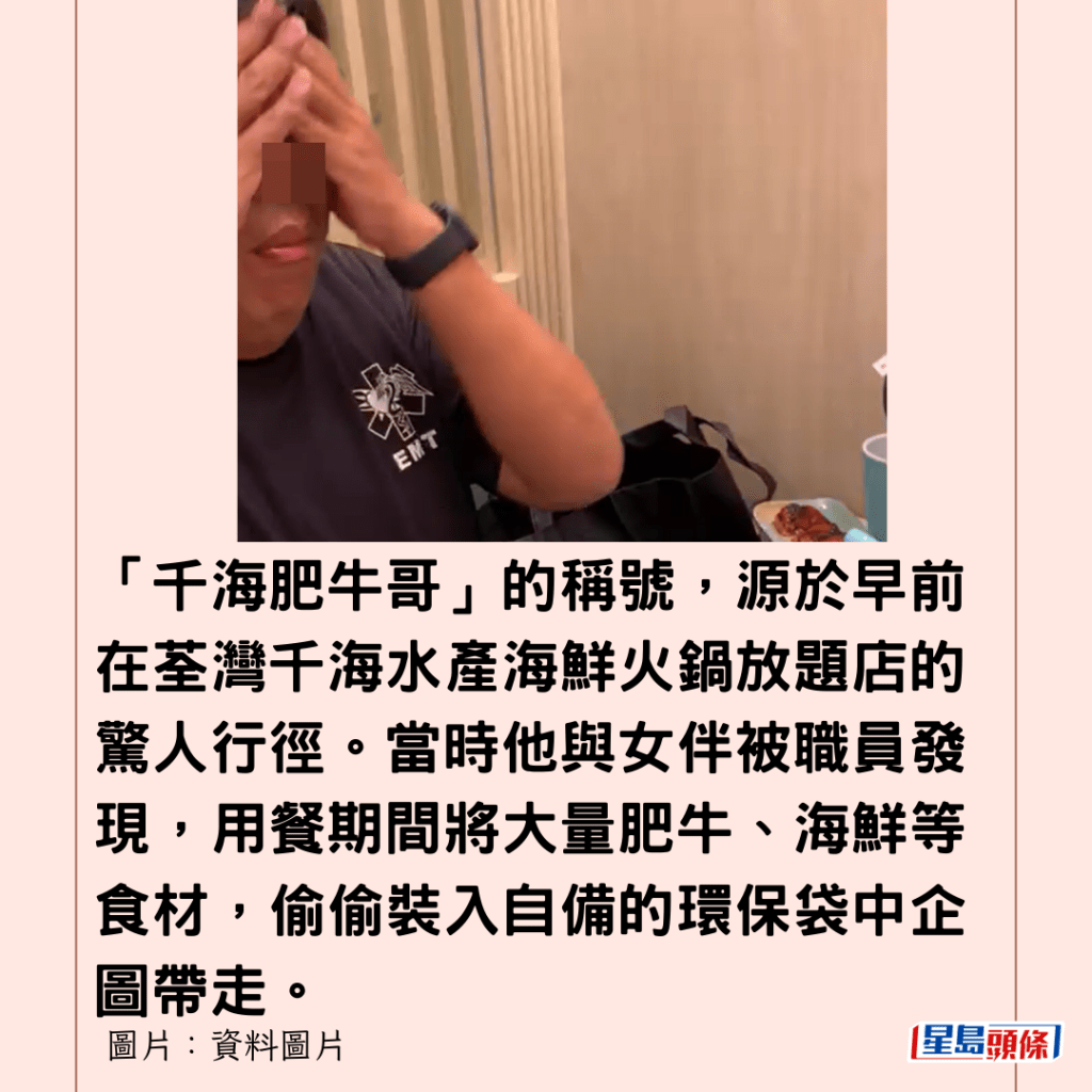 「千海肥牛哥」的稱號,源於早前在荃灣千海水產海鮮火鍋放題店的驚人行徑。當時他與女伴被職員發現,用餐期間將大量肥牛、海鮮等食材,偷偷裝入自備的環保袋中企圖帶走。在職員要求他將食材放回時,他徒手抓起一把肥牛,隨後竟用同一隻手整理頭髮,這個動作被網民戲稱為「肥牛Gel頭」,影片在今年九月瘋傳後,使他瞬間成為網絡紅人。