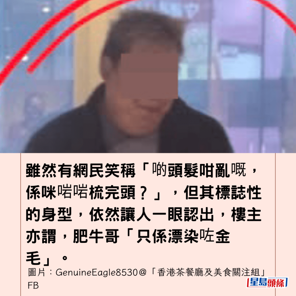 從樓主上傳的相片可見,肥牛哥一改昔日形象,換上了一頭漂染的搶眼金髮,雖然有網民笑稱「啲頭髮咁亂嘅,係咪啱啱梳完頭?」,但其標誌性的身型,依然讓人一眼認出,樓主亦謂,肥牛哥「只係漂染咗金毛」。