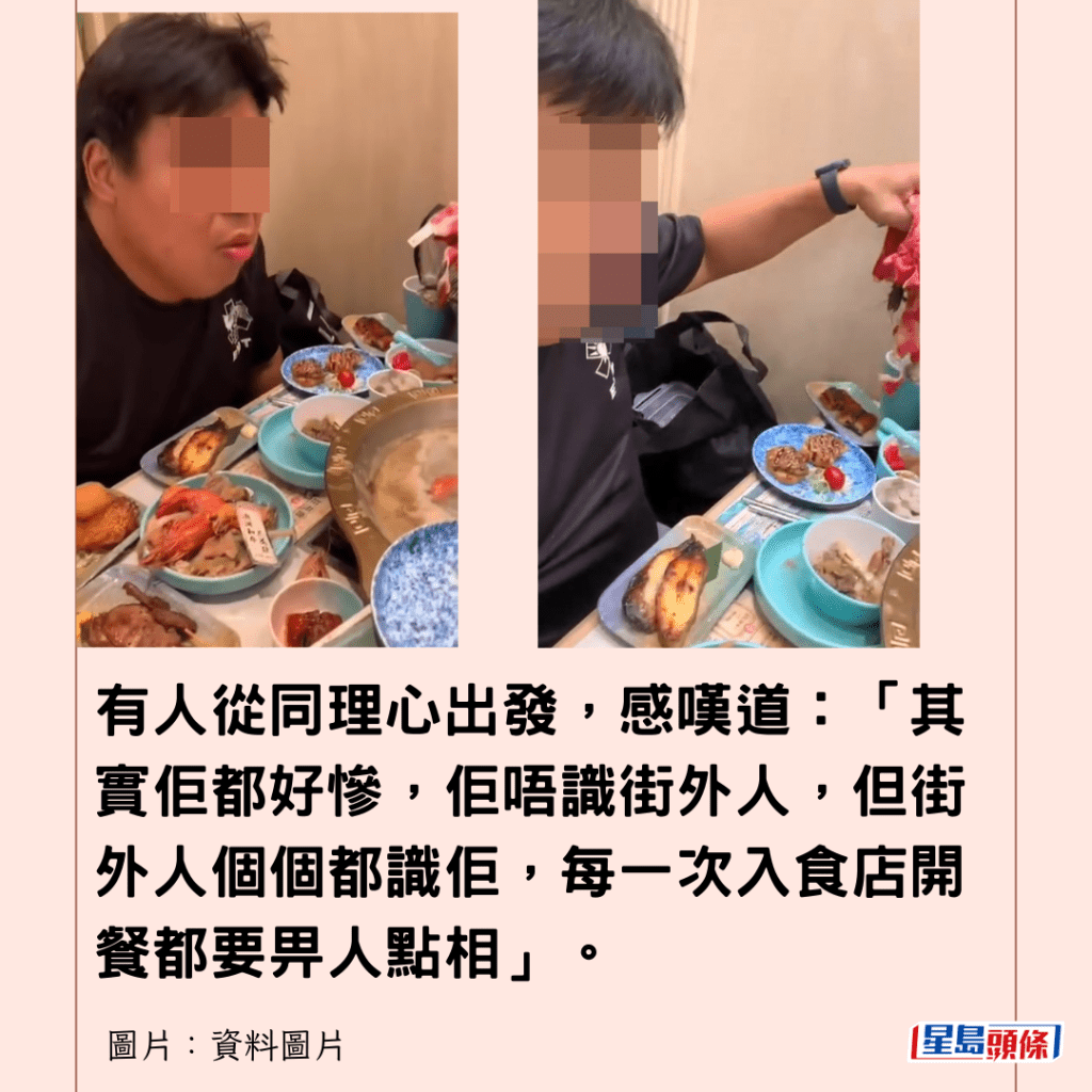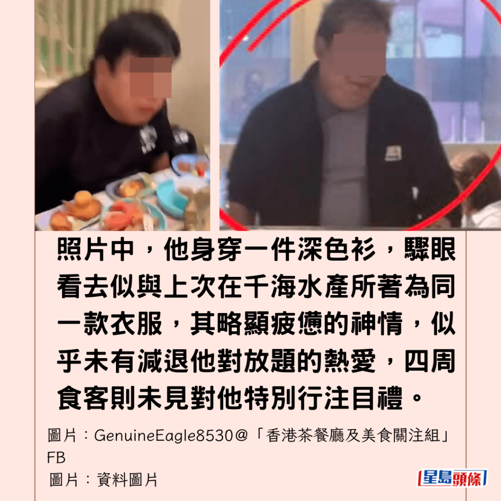 照片中,他身穿一件深色衫,驟眼看去似與上次在千海水產所著為同一款衣服,其略顯疲憊的神情,似乎未有減退他對放題的熱愛,四周食客則未見對他特別行注目禮。