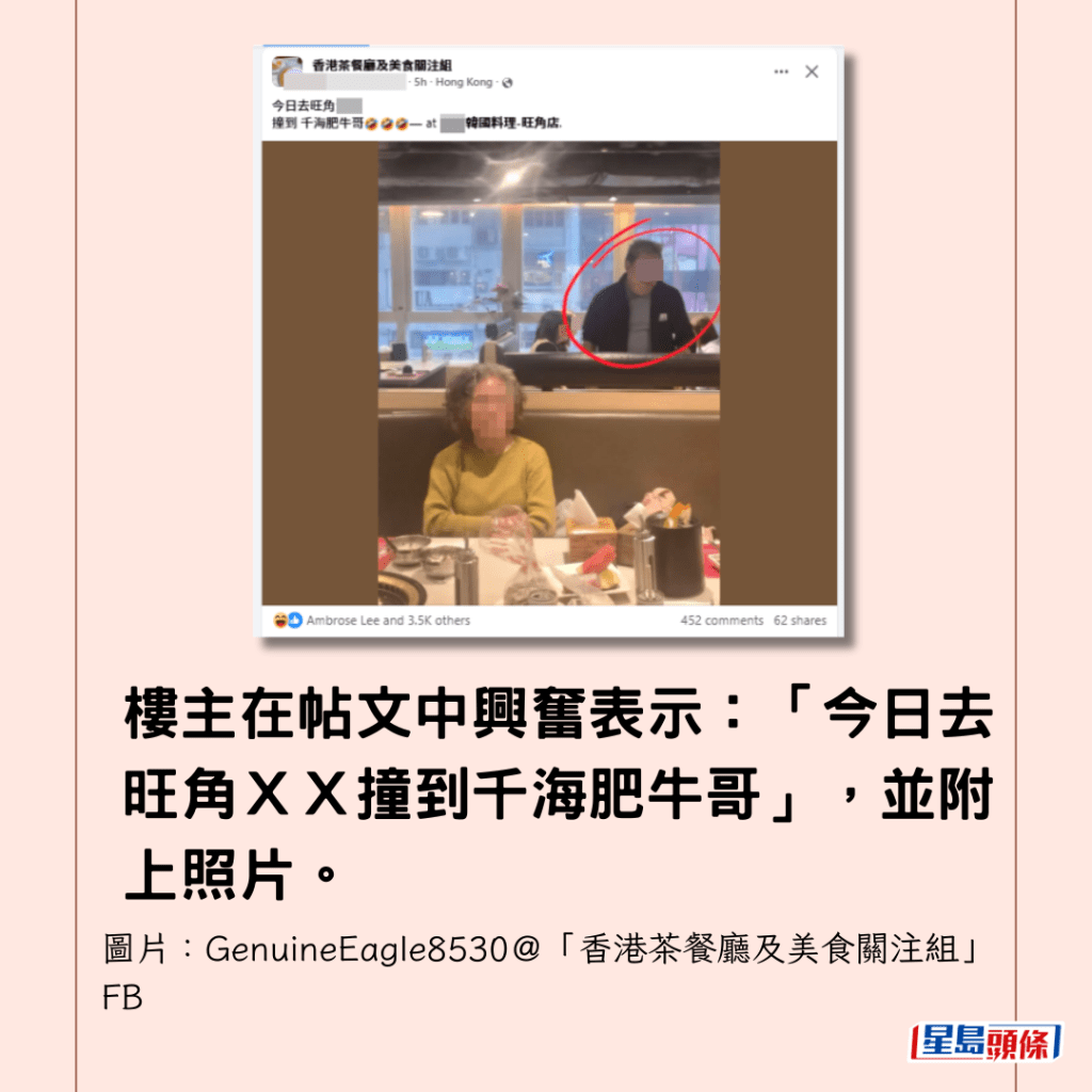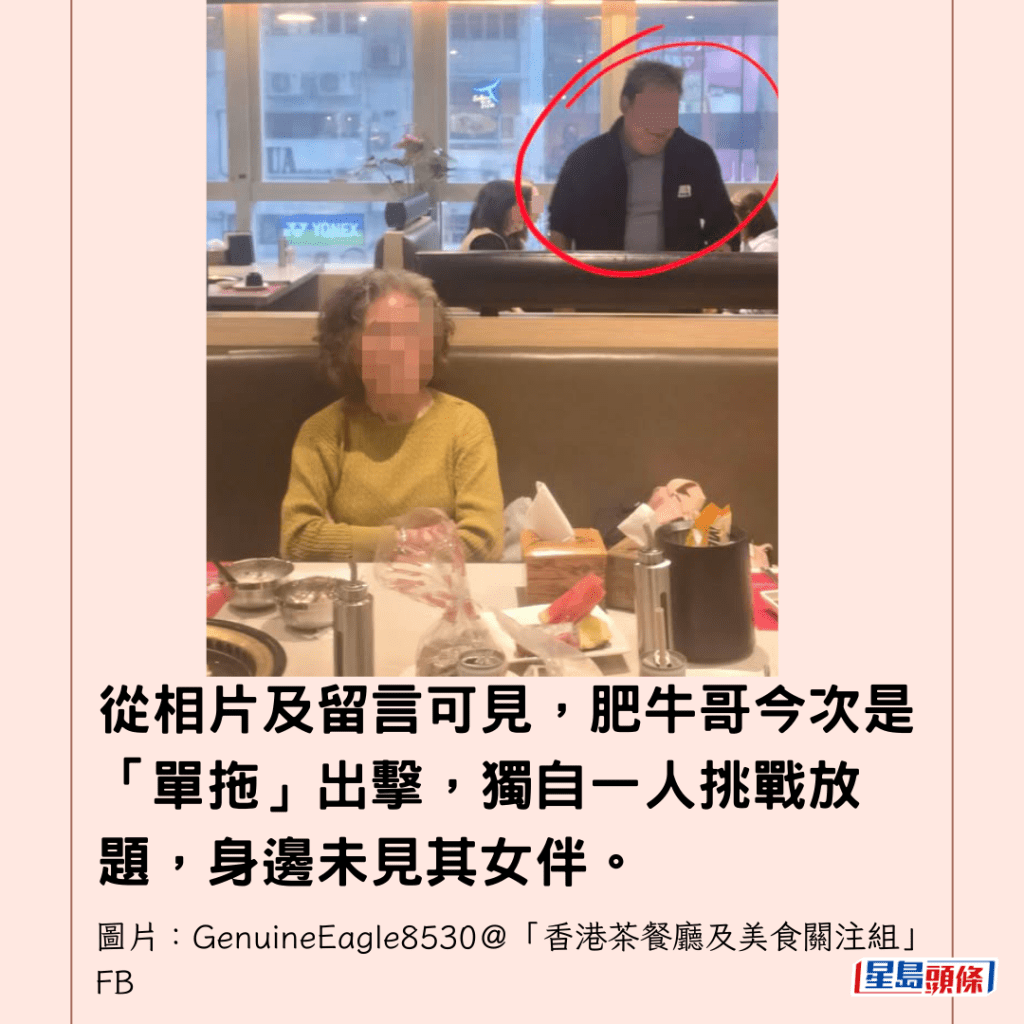 樓主在帖文中興奮表示:「今日去旺角XX撞到千海肥牛哥」,並附上照片。從相片及留言可見,肥牛哥今次是「單拖」出擊,獨自一人挑戰放題,身邊未見其女伴。