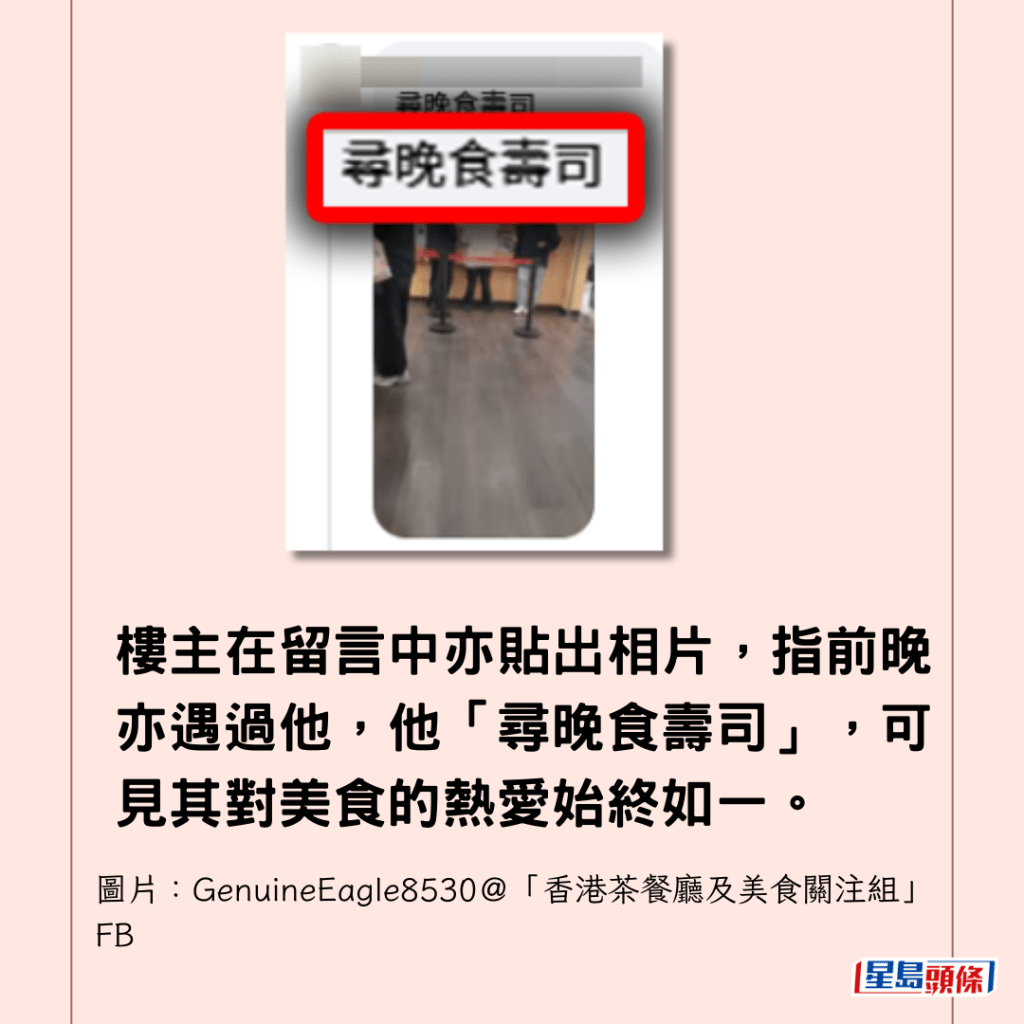 樓主在留言中亦貼出相片,指前晚亦遇過他,他「尋晚食壽司」,可見其對美食的熱愛始終如一。