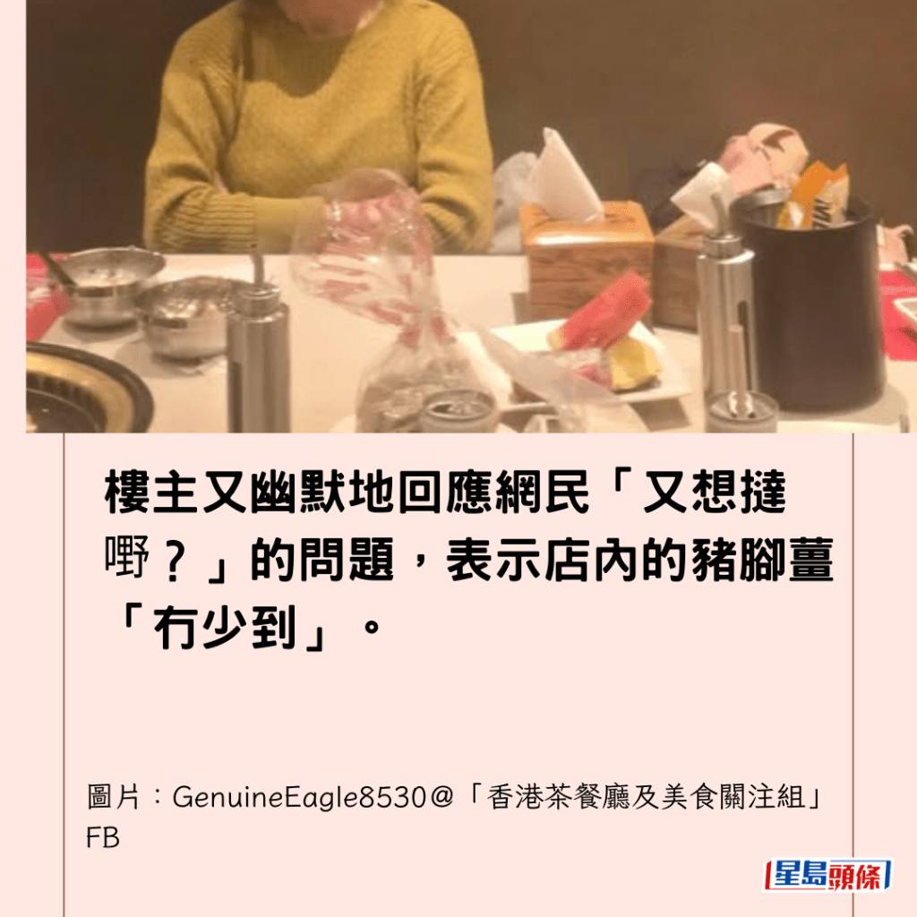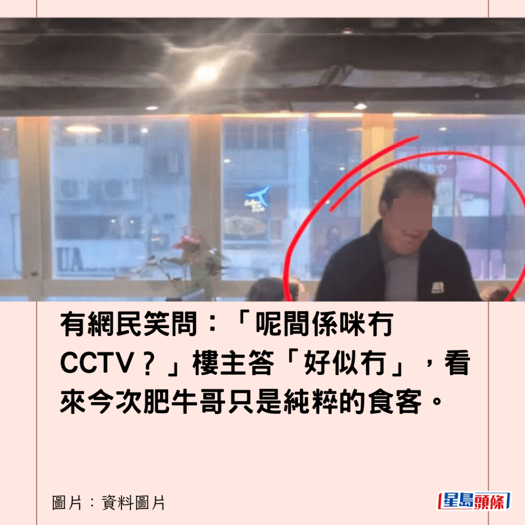 樓主又幽默地回應網民「又想撻嘢?」的問題,表示店內的豬腳薑「冇少到」。有網民笑問:「呢間係咪冇CCTV?」樓主答「好似冇」,看來今次肥牛哥只是純粹的食客。