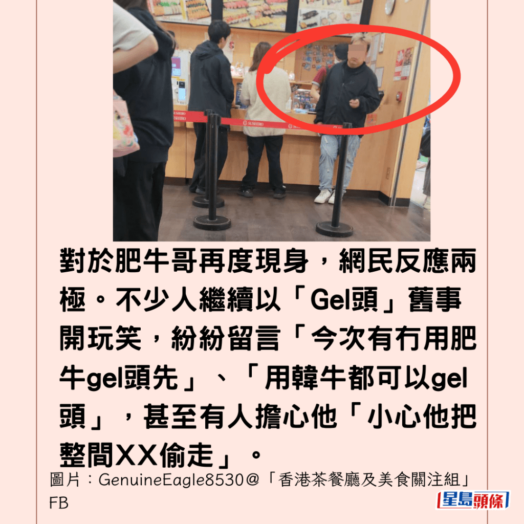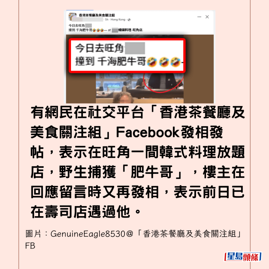 有網民昨日(25日)在社交平台「香港茶餐廳及美食關注組」Facebook發相發帖,表示在旺角一間韓式料理放題店,野生捕獲「肥牛哥」,樓主在回應留言時又再發相,表示前日(24日)已在壽司店遇過他。