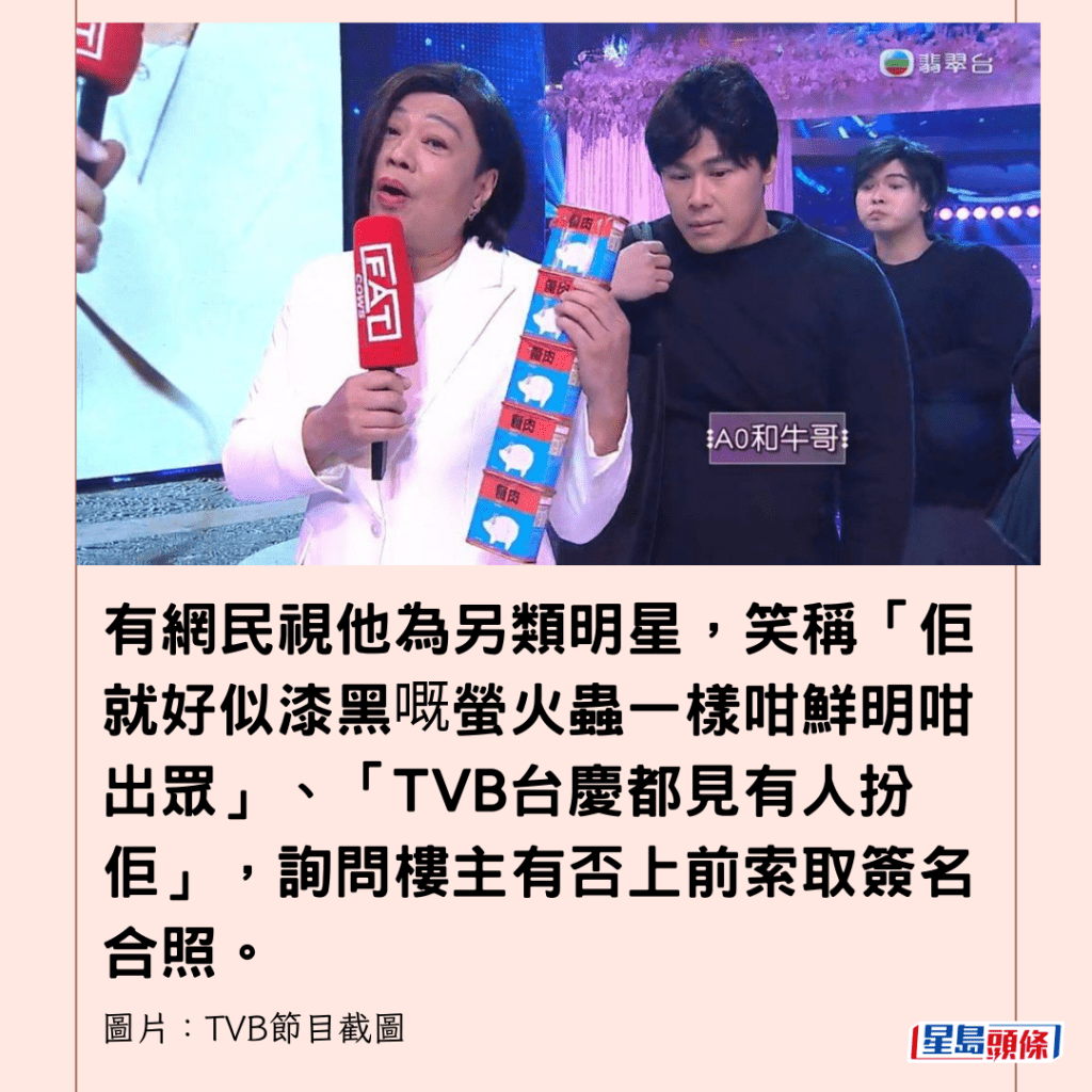 由於處境喜劇《愛·回家之開心速遞》亦有橋段向其「致敬」,有網民視他為另類明星,笑稱「佢就好似漆黑嘅螢火蟲一樣咁鮮明咁出眾」、「TVB台慶都見有人扮佢」,詢問樓主有否上前索取簽名合照。