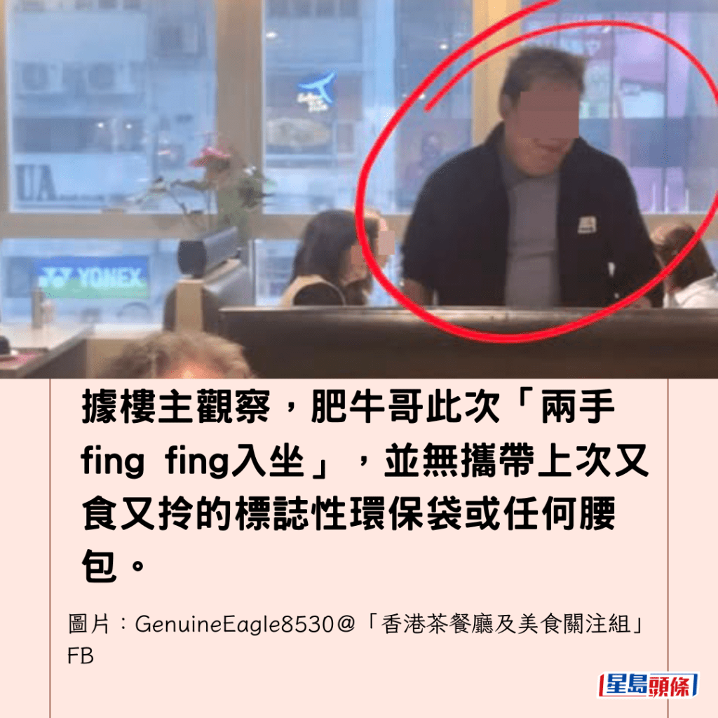 據樓主觀察,肥牛哥此次「兩手fing fing入坐」,並無攜帶上次又食又拎的標誌性環保袋或任何腰包。