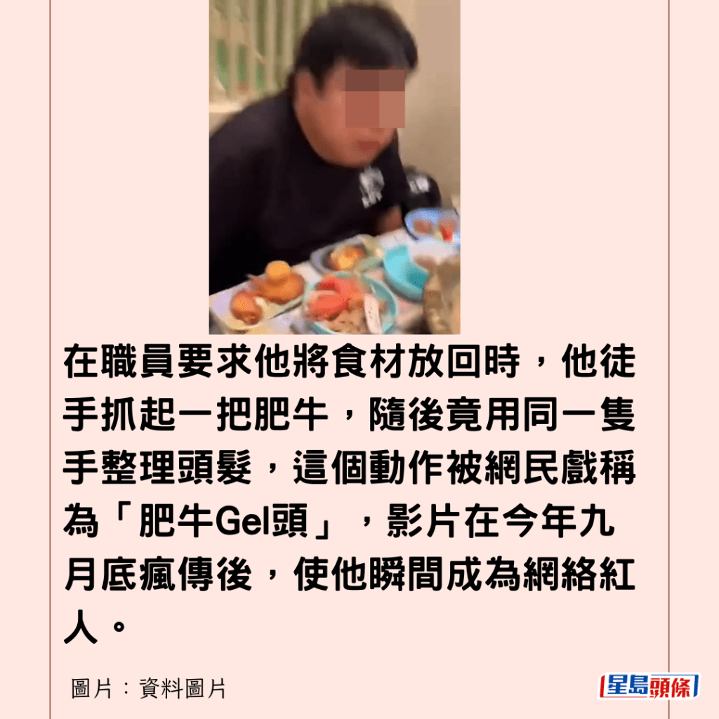 因在荃灣千海水產火鍋放題店「又食又拎」,加上「肥牛Gel頭」一事而紅遍網絡的「千海肥牛哥」,昨日(25日)被網民在旺角一間放題店「野生捕獲」,最新實況照顯示肥牛哥有新造型,目擊者並向網民直擊他在店內的一舉一動,與及交代網民最關心的問題:「今次有冇帶袋?」