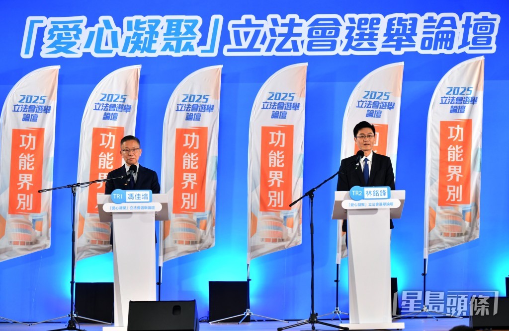 政府主辦的「愛心凝聚」立法會選舉論壇今(4日)繼續舉辦,首場辯論是航運交通界,候選人包括香港船東會中國事務總監馮佳培,以及任職於招商局旗下香港明華船務、世界航商大會董事長兼總經理林銘鋒。論壇開始時,全場站立默哀一分鐘,並取消助選團打氣環節。