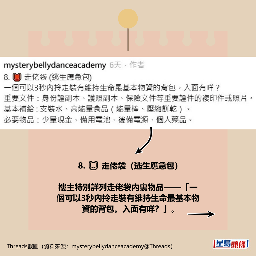 樓主特別詳列走佬袋內裏物品——「一個可以3秒內拎走裝有維持生命最基本物資的背包。入面有咩?」。