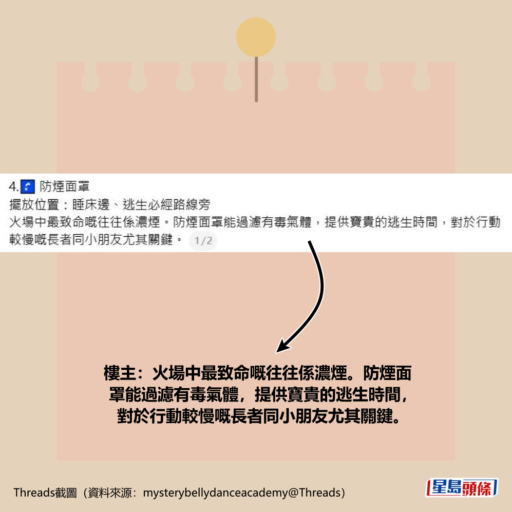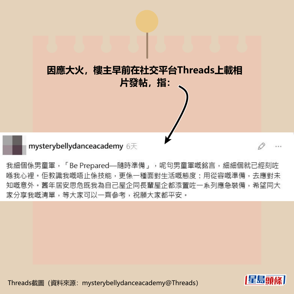 因應大火,樓主早前在社交平台Threads上載相片發帖,指「我細個係男童軍,『Be Prepared—隨時準備』」,呢句男童軍嘅銘言,細細個就已經刻咗喺我心裏。佢教識我嘅唔止係技能,更係一種面對生活嘅態度:用從容嘅準備,去應對未知嘅意外」。