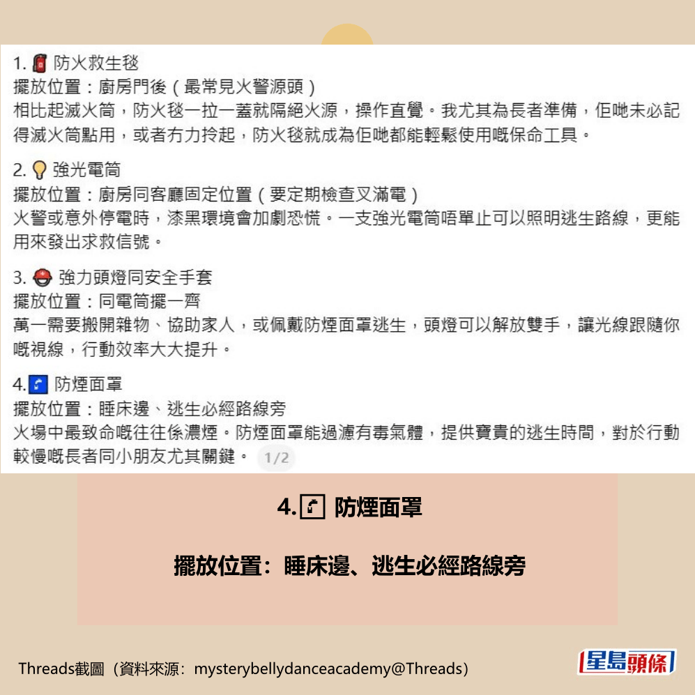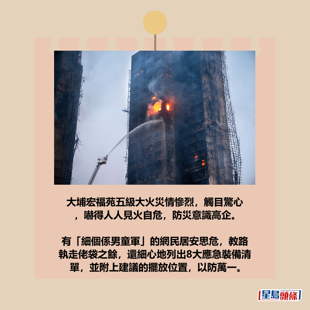 大埔宏福苑五級大火災情慘烈,觸目驚心,嚇得人人見火自危,防災意識高企。有「細個係男童軍」的網民居安思危,教路執走佬袋之餘,還細心地列出8大應急裝備清單,並附上建議的擺放位置,以防萬一。詳情見下圖及下文: