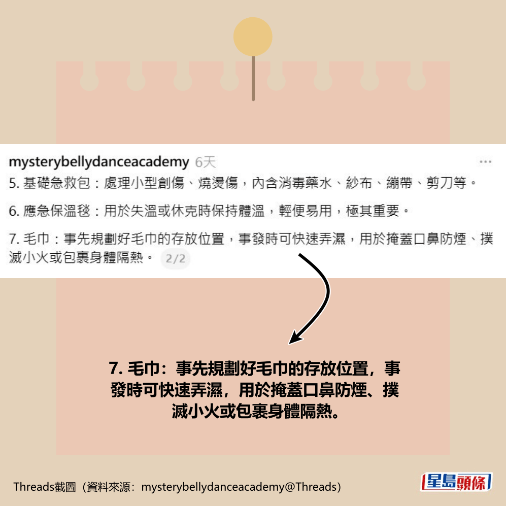 7. 毛巾:事先規劃好毛巾的存放位置,事發時可快速弄濕,用於掩蓋口鼻防煙、撲滅小火或包裹身體隔熱。