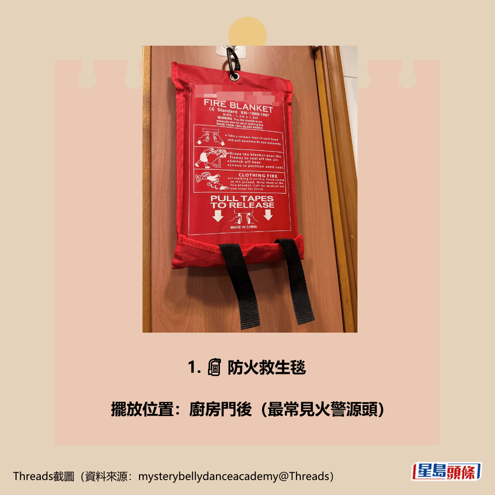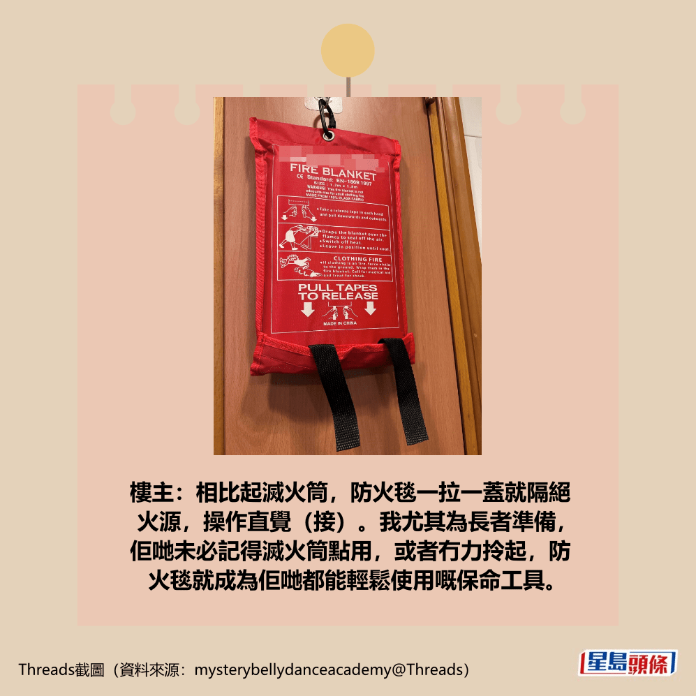相比起滅火筒,防火毯一拉一蓋就隔絕火源,操作直覺(接)。我尤其為長者準備,佢哋未必記得滅火筒點用,或者冇力拎起,防火毯就成為佢哋都能輕鬆使用嘅保命工具。
