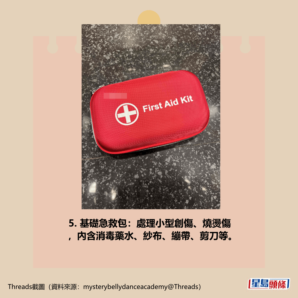 5. 基礎急救包:處理小型創傷、燒燙傷,內含消毒藥水、紗布、繃帶、剪刀等。
