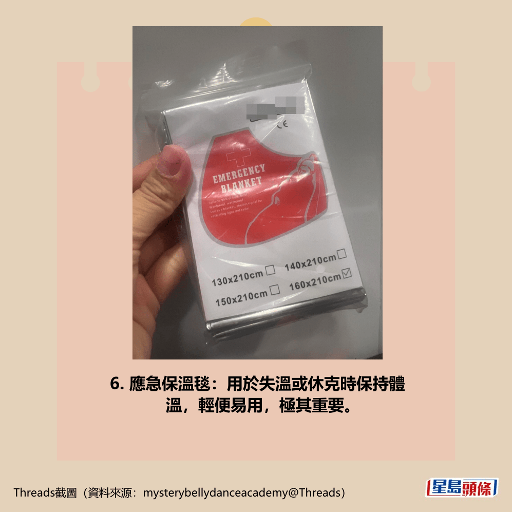 6. 應急保溫毯:用於失溫或休克時保持體溫,輕便易用,極其重要。