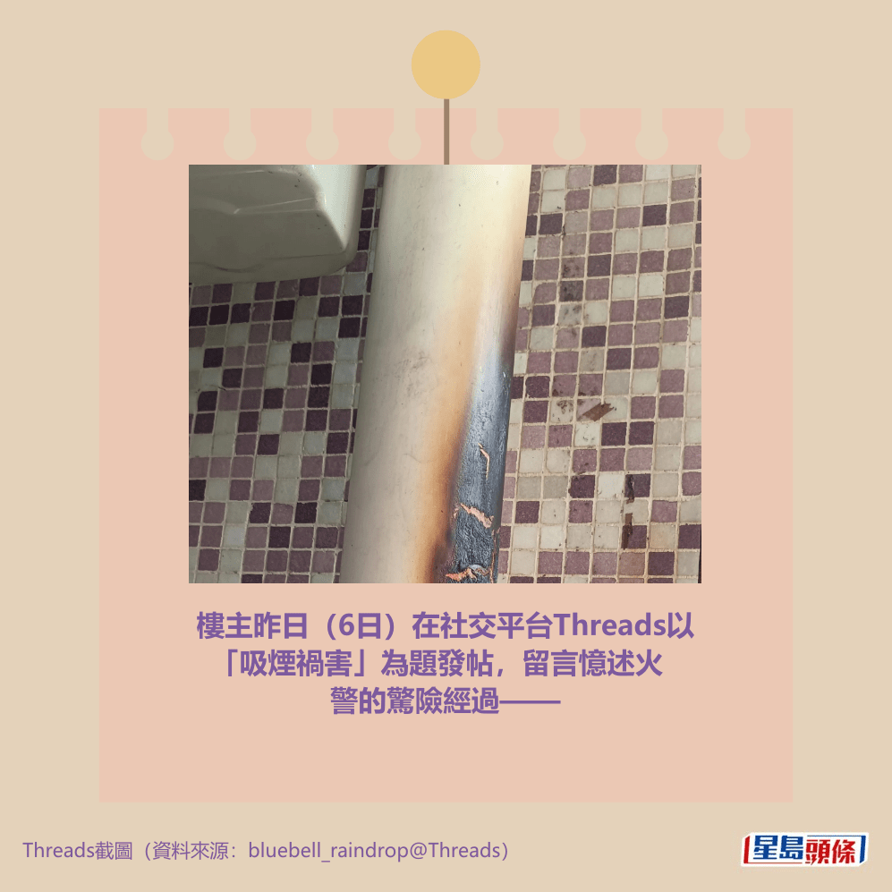 樓主昨日(6日)在社交平台Threads以「吸煙禍害」為題發帖,留言憶述火警的驚險經過——