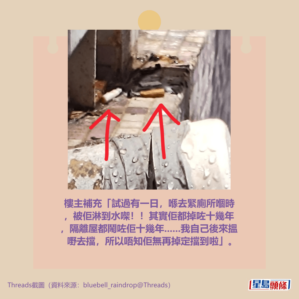 樓主補充「試過有一日,喺去緊廁所嗰時,被佢淋到水㗎!!其實佢都掉咗十幾年,隔離屋都鬧咗佢十幾年……我自己後來搵嘢去擋,所以唔知佢無再掉定擋到啦」。