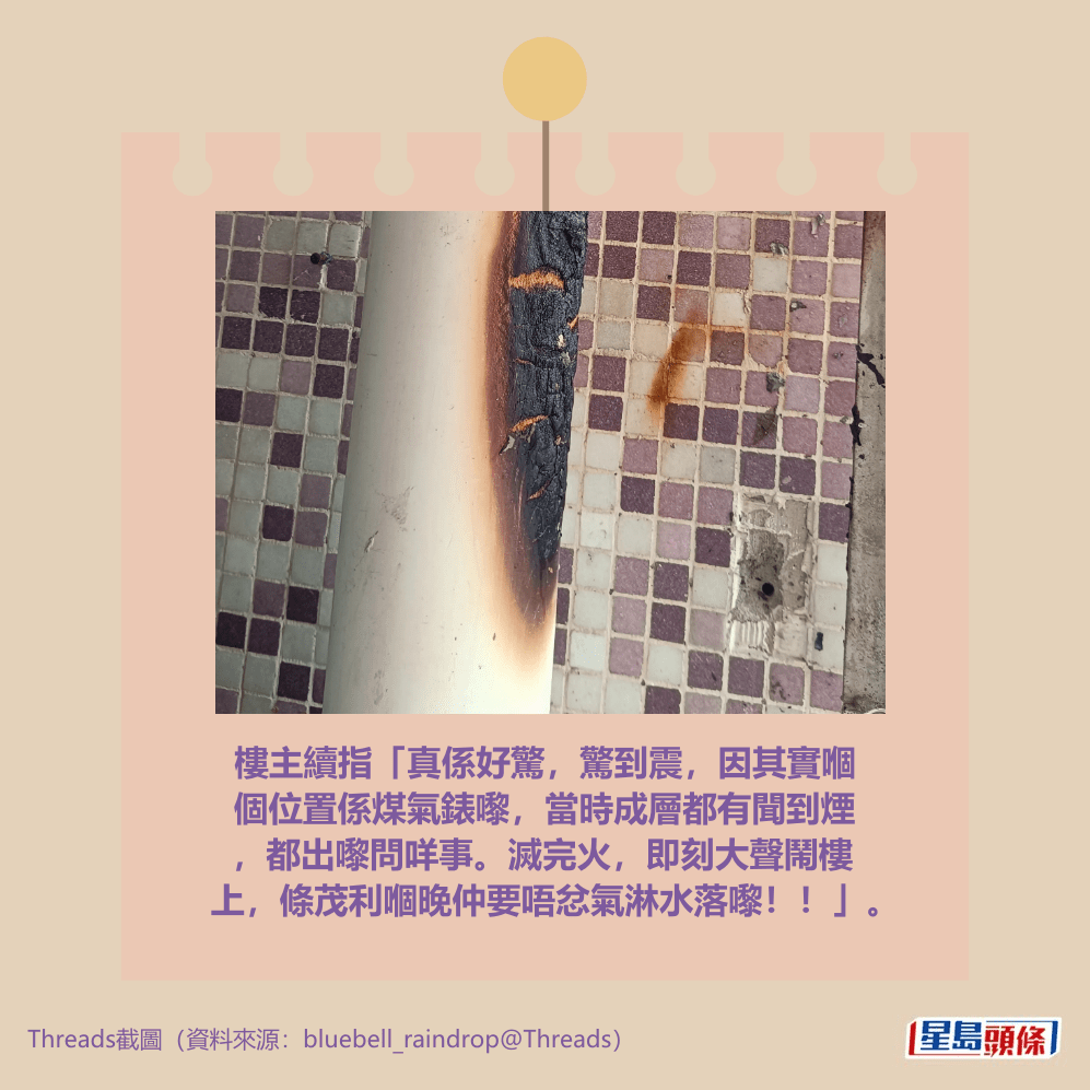 樓主續指「真係好驚,驚到震,因其實嗰個位置係煤氣錶嚟,當時成層都有聞到煙,都出嚟問咩事。滅完火,即刻大聲鬧樓上,條茂利嗰晚仲要唔忿氣淋水落嚟!!」。