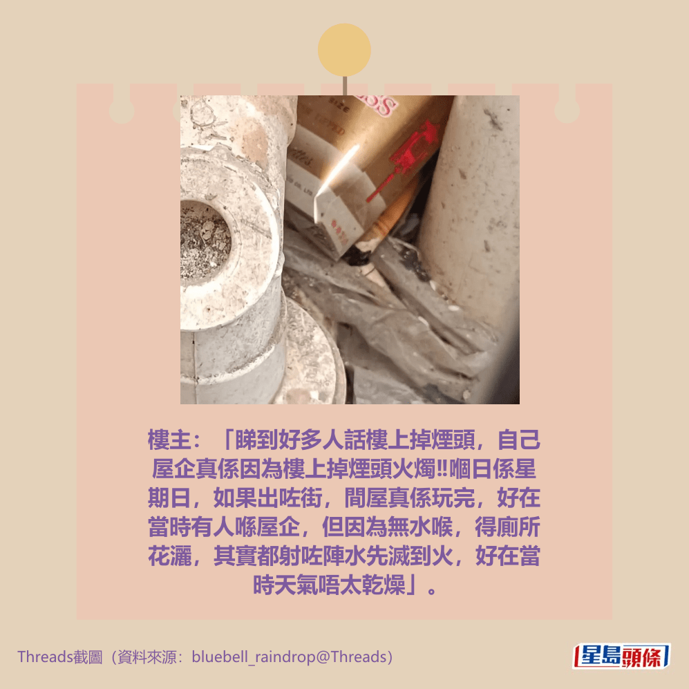 「睇到好多人話樓上掉煙頭,自己屋企真係因為樓上掉煙頭火燭‼️嗰日係星期日,如果出咗街,間屋真係玩完,好在當時有人喺屋企,但因為無水喉,得廁所花灑,其實都射咗陣水先滅到火,好在當時天氣唔太乾燥」。