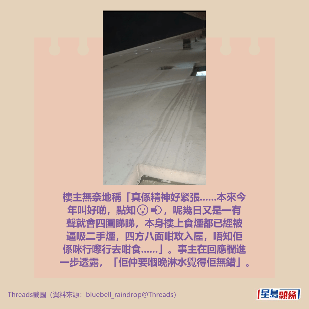 樓主無奈地稱「真係精神好緊張……本來今年叫好啲,點知😮💨,呢幾日又是一有聲就會四圍睇睇,本身樓上食煙都已經被逼吸二手煙,四方八面咁攻入屋,唔知佢係咪行嚟行去咁食……」。事主在回應欄進一步透露,「佢仲要嗰晚淋水覺得佢無錯」。