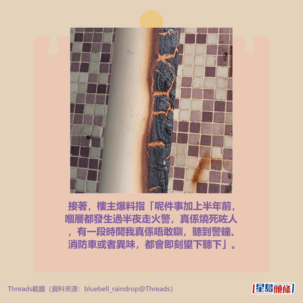 接著,樓主爆料指「呢件事加上半年前,嗰層都發生過半夜走火警,真係燒死咗人,有一段時間我真係唔敢瞓,聽到警鐘、消防車或者異味,都會即刻望下聽下」。