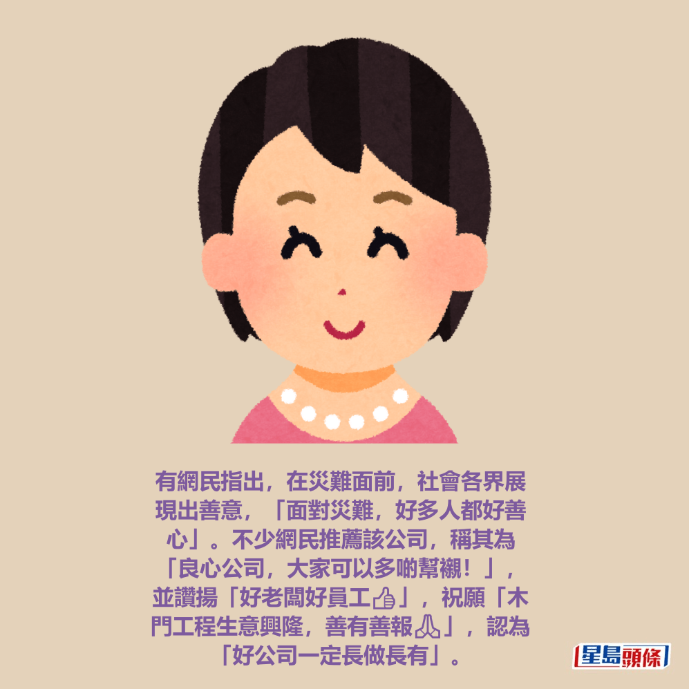 有網民指出,在災難面前,社會各界展現出善意,「面對災難,好多人都好善心」。不少網民推薦該公司,稱其為「良心公司,大家可以多啲幫襯!」,並讚揚「好老闆好員工👍」,祝願「木門工程生意興隆,善有善報🙏🏻」,認為「好公司一定長做長有」。