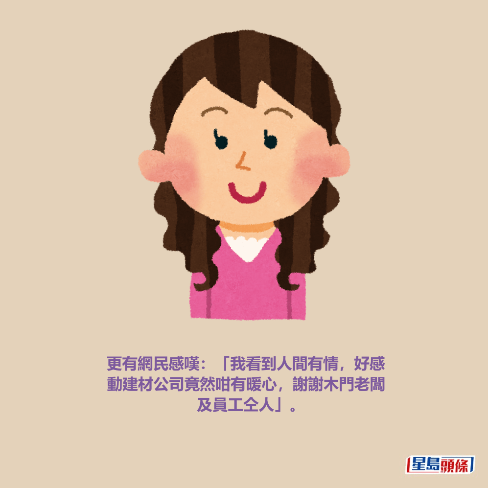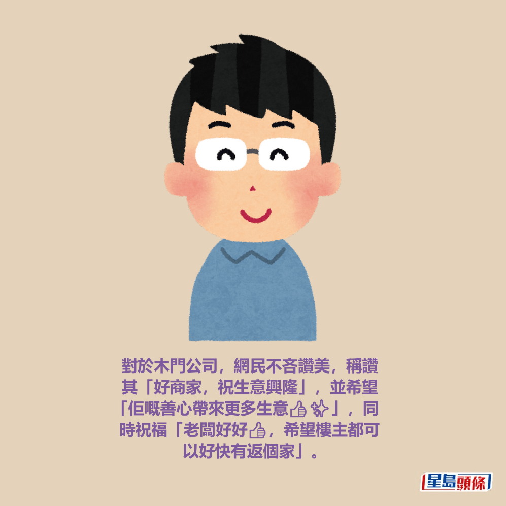 對於木門公司,網民不吝讚美,稱讚其「好商家,祝生意興隆」,並希望「佢嘅善心帶來更多生意👍🏻✨」,同時祝福「老闆好好👍🏻,希望樓主都可以好快有返個家」。