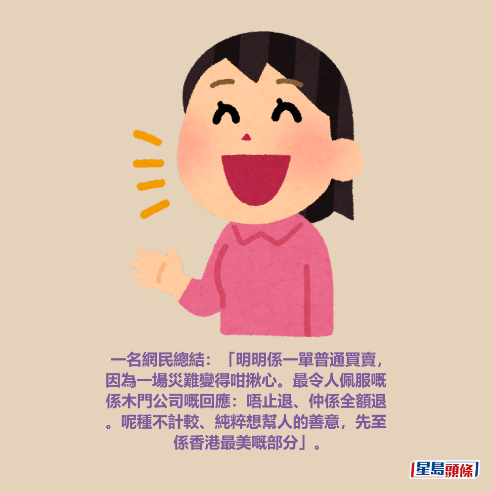 一名網民總結:「明明係一單普通買賣,因為一場災難變得咁揪心。最令人佩服嘅係木門公司嘅回應:唔止退、仲係全額退。呢種不計較、純粹想幫人的善意,先至係香港最美嘅部分」。