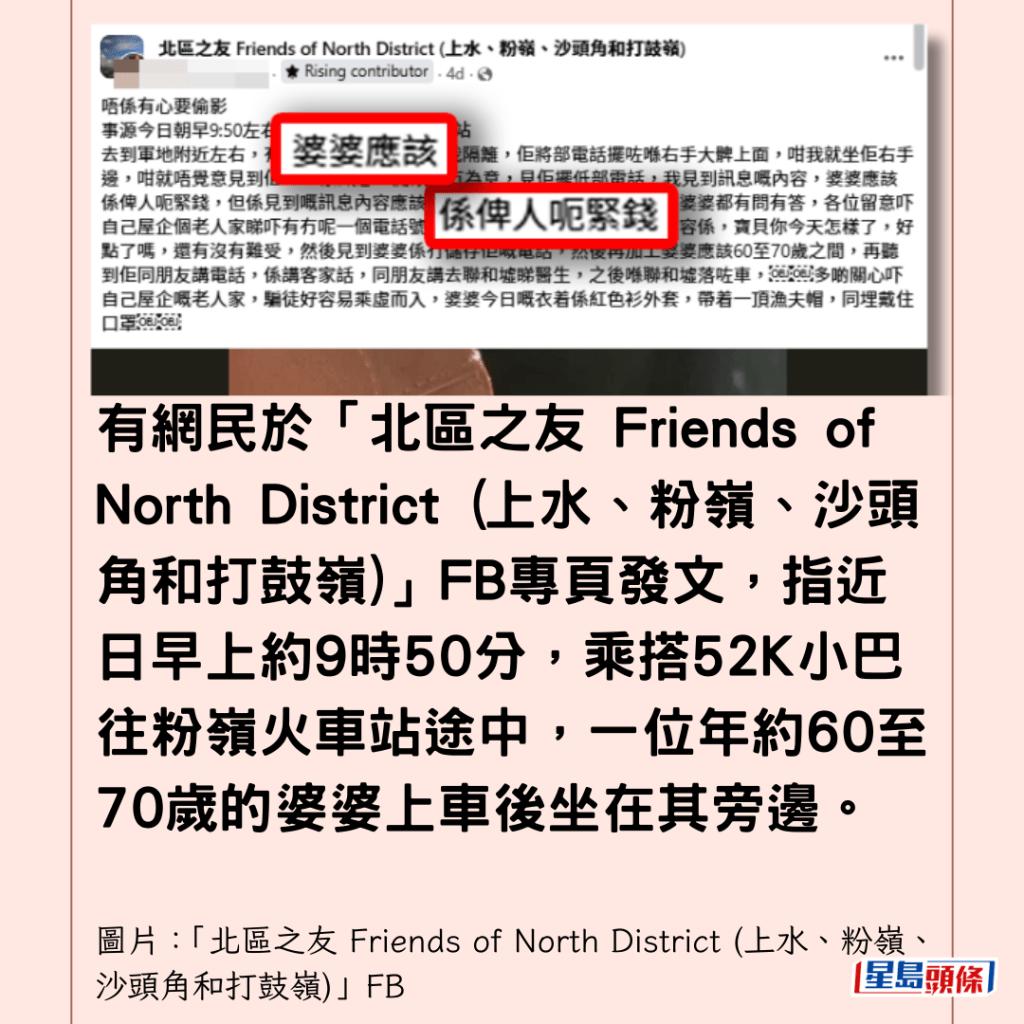 有網民於「北區之友 Friends of North District (上水、粉嶺、沙頭角和打鼓嶺)」FB專頁發文,指近日早上約9時50分,乘搭52K小巴往粉嶺火車站途中,一位年約60至70歲的婆婆上車後坐在其旁邊。