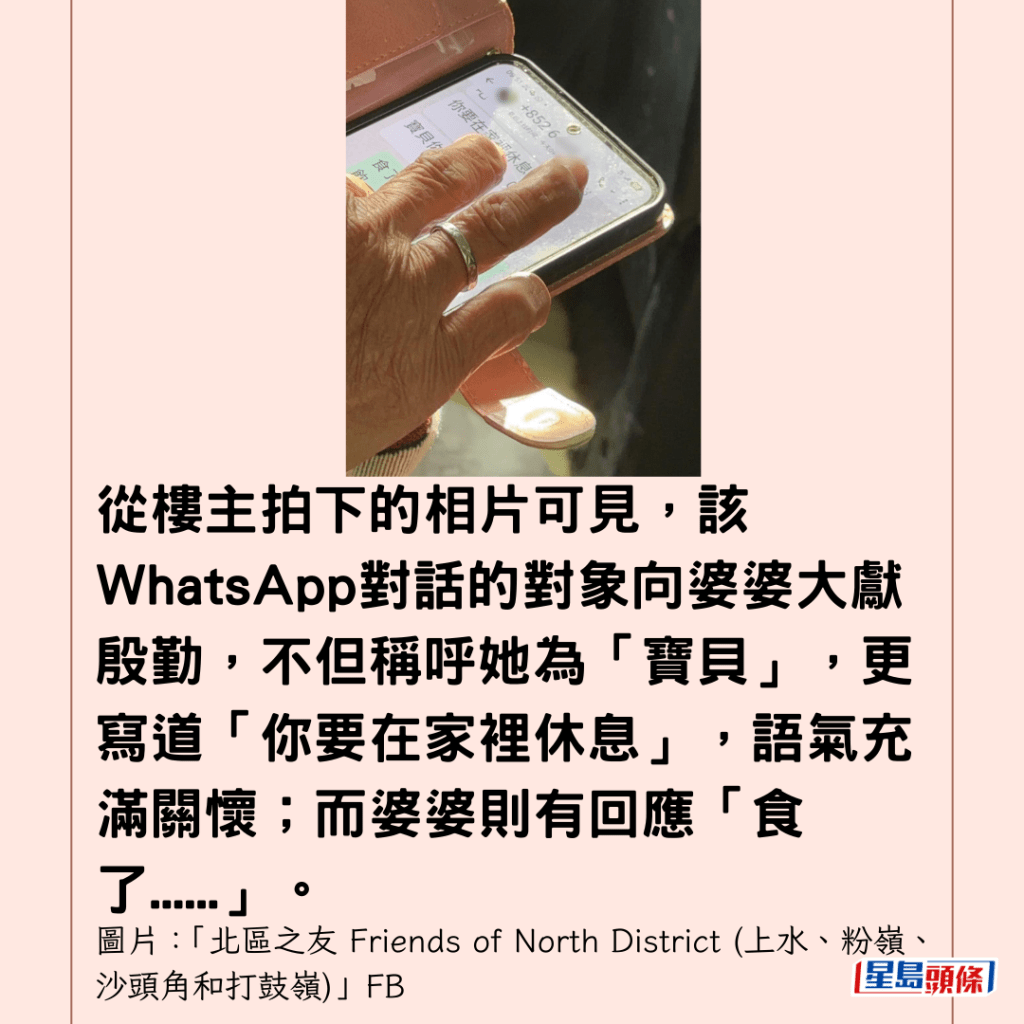 從樓主拍下的相片可見,該WhatsApp對話的對象向婆婆大獻殷勤,不但稱呼她為「寶貝」,更寫道「你要在家裡休息」,語氣充滿關懷;而婆婆則有回應「食了……」。