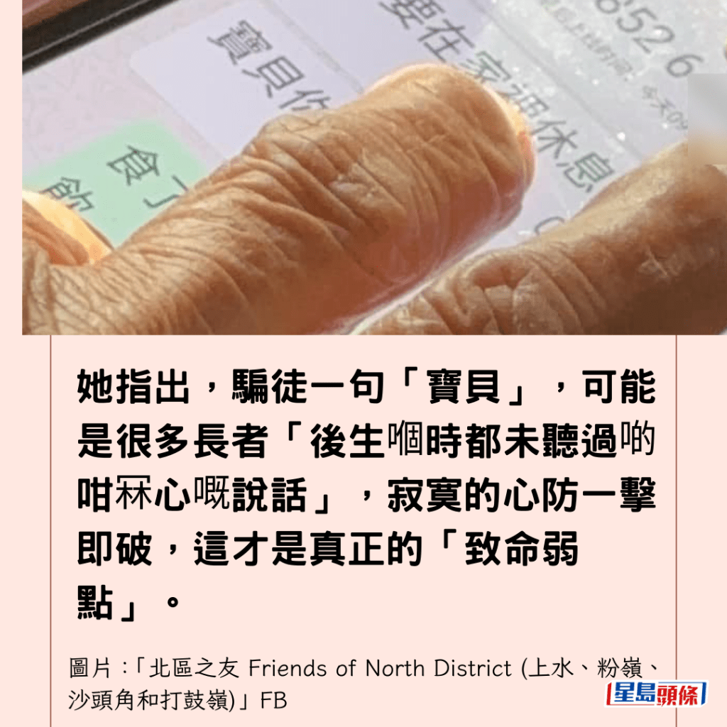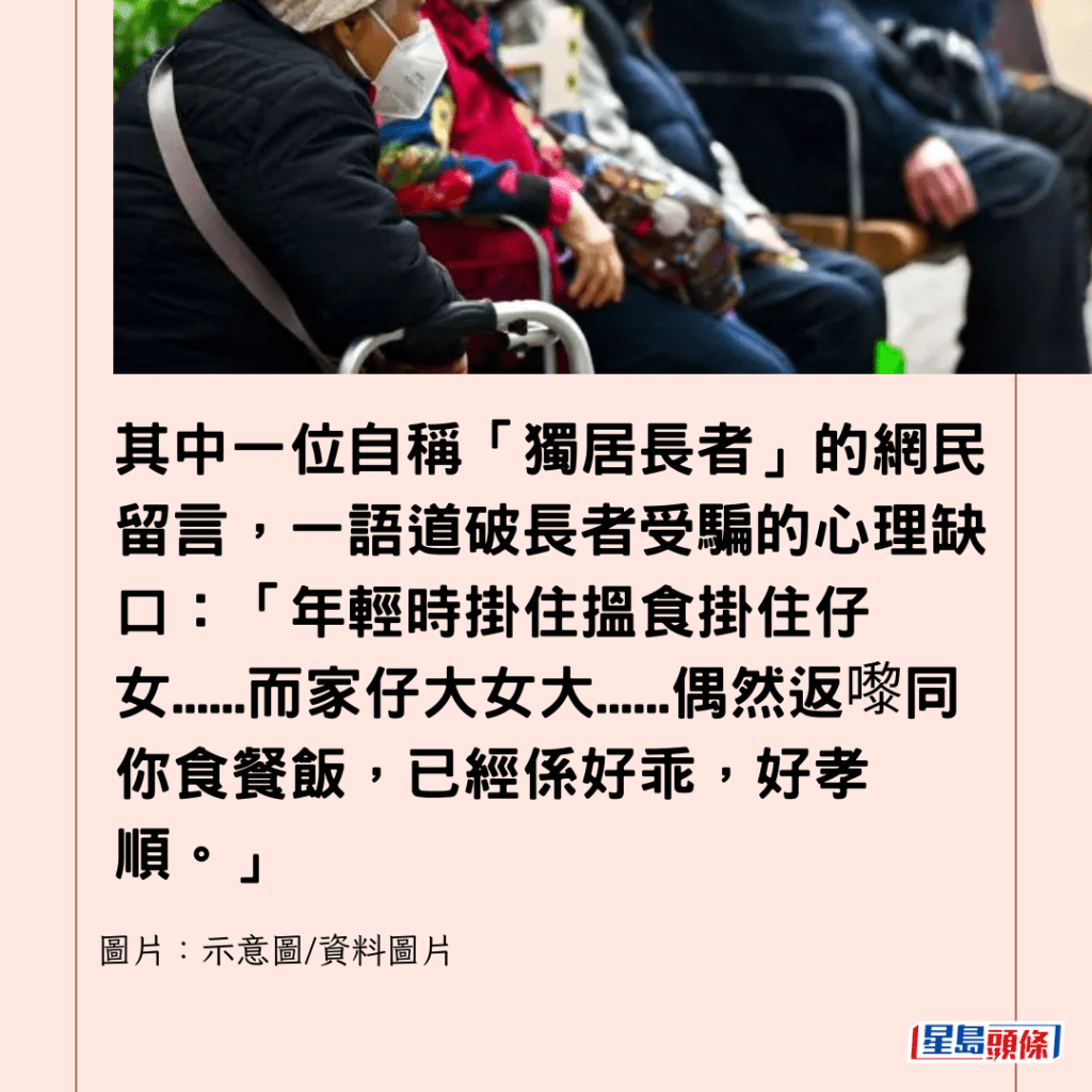 其中一位自稱「獨居長者」的網民留言,一語道破長者受騙的心理缺口,其實長者被騙從來不是蠢:「年輕時掛住搵食掛住仔女……而家仔大女大……偶然返嚟同你食餐飯,已經係好乖,好孝順。」她指出,騙徒一句「寶貝」,可能是很多長者「後生嗰時都未聽過啲咁冧心嘅說話」,寂寞的心防一擊即破,這才是真正的「致命弱點」。