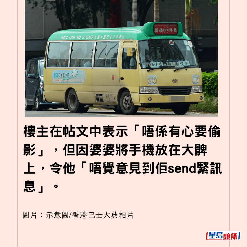 樓主在帖文中表示「唔係有心要偷影」,但因婆婆將手機放在大髀上,令他「唔覺意見到佢send緊訊息」。
